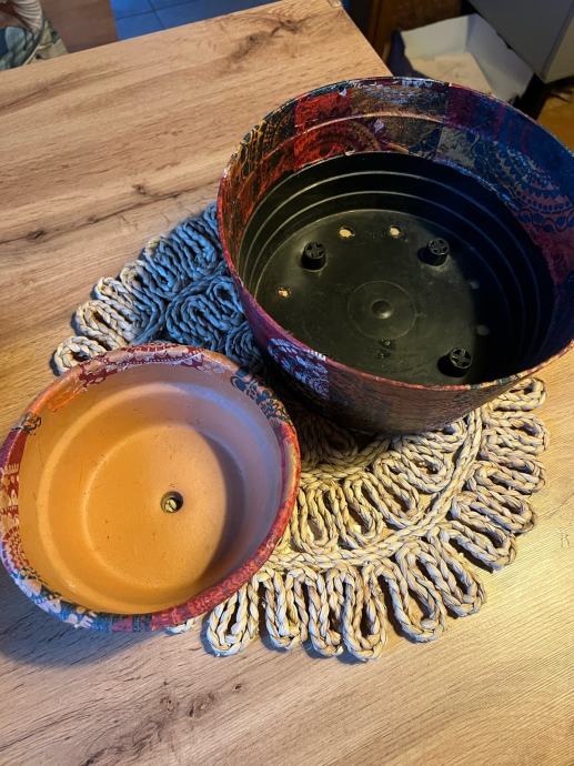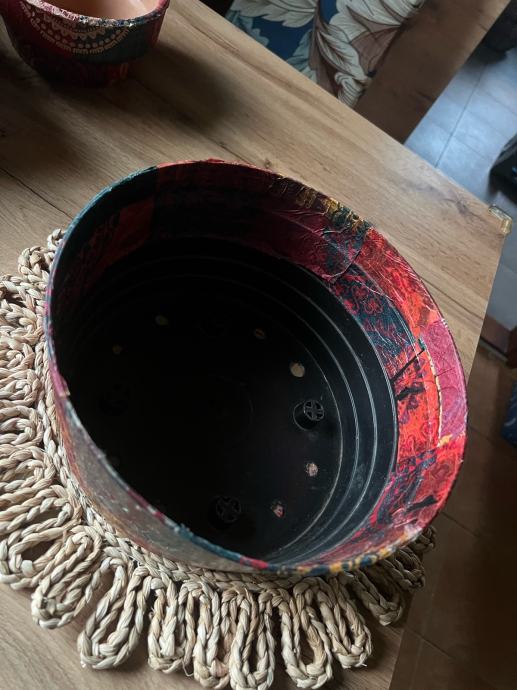 Veća posuda je cilindričnog oblika s unutarnjim plastičnim umetkom koji ima otvore za odvodnju, što je čini prikladnom za sadnju biljaka. Manja posuda ima keramičko dno narančaste boje. Obje posude zajedno čine usklađen dekorativan par koji lijepo izgleda u svakom prostoru.
