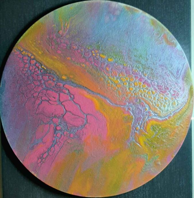 Na prodaji je predivna abstraktna slika promjera 30cm naslikana tehnikom Fluid Art/Pour Art na vrhunskom platnu bojama visoke kvalitete.
