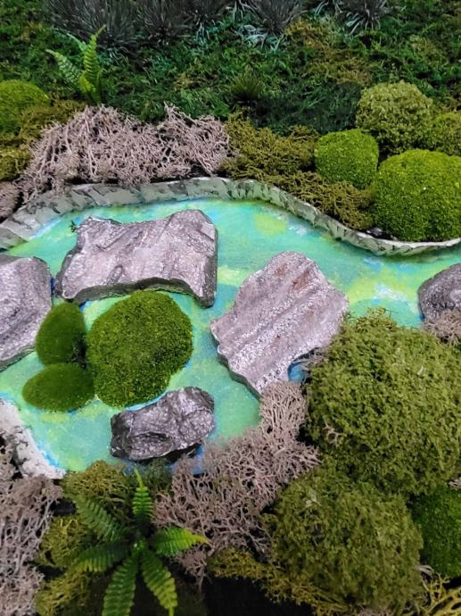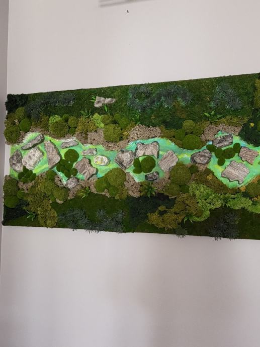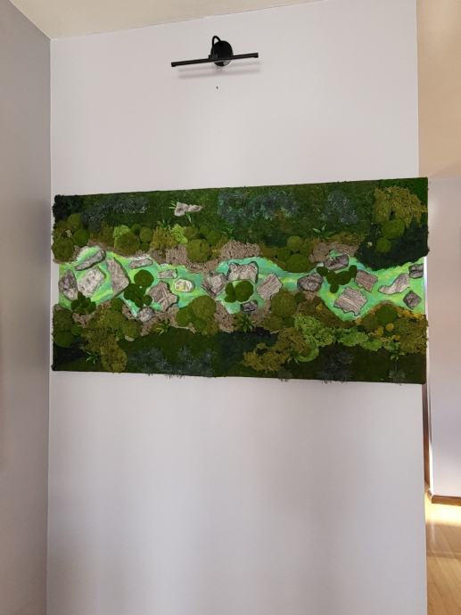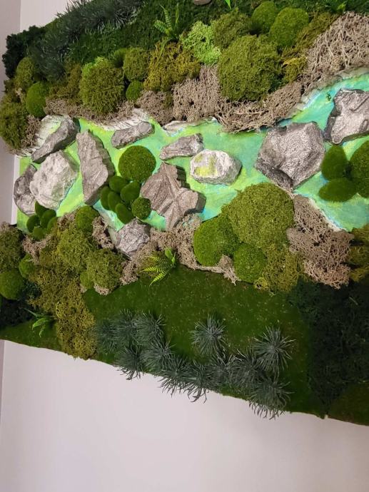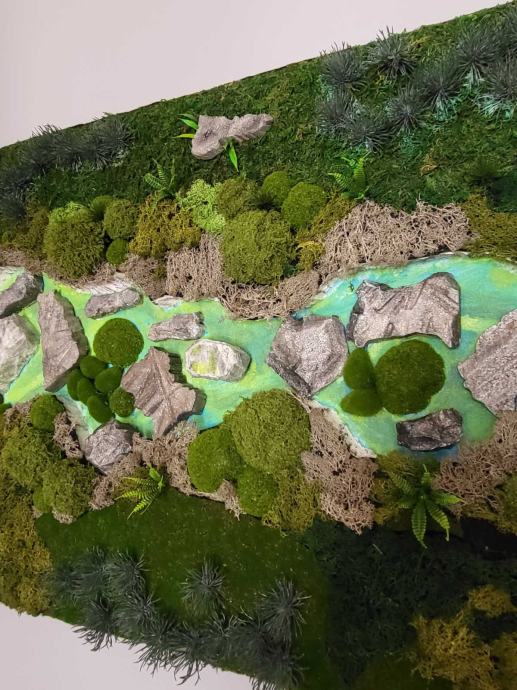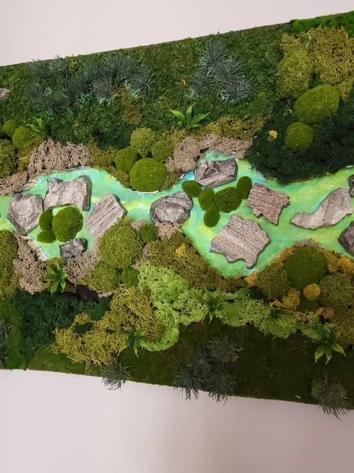 Prodajem jedinstvenu dekorativnu sliku izrađenu od prirodne mahovine. Slika prikazuje prirodan krajolik s zelenom rijekom ili jezerom, oblogama od kamena i različitim vrstama mahovine u nijansama zelene boje. Kombinacija prirodnih materijala – mahovine, i podloge – stvara trodimenzionalni efekt koji donosi dašak prirode u prostor.