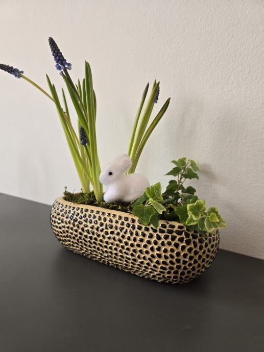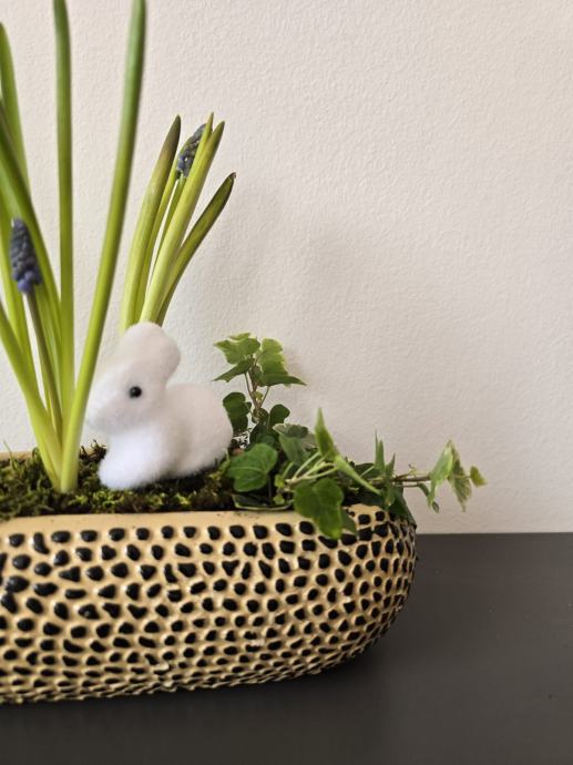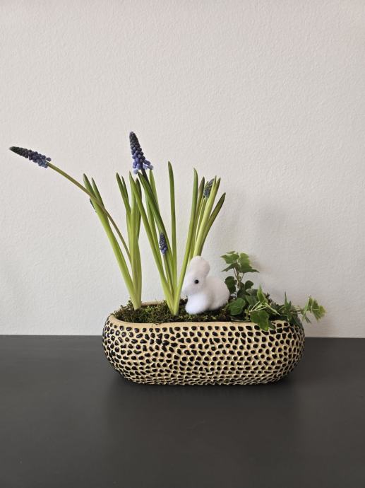 U aranžmanu se nalaze biljka presličica (Muacari) i ukrasni bršljan (Hedera). Obje biljke su vrlo jednostavne za održavanje, a mahovina im zadržava vlagu pa ih ne treba prečesto zalijevati. Nakon što ocvjetaju, lukovice možete sačuvati za slijedeće proljeće.