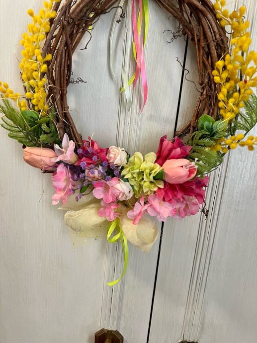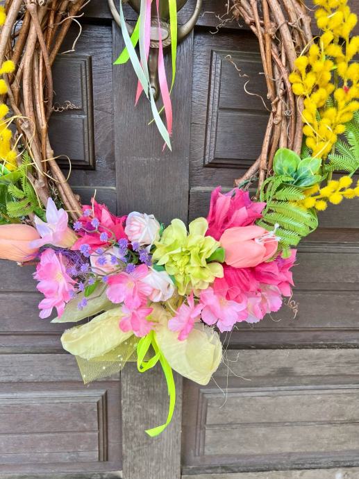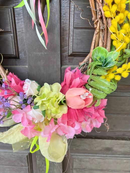 Prodajem novi proljetni vijenac izrađen na prirodnoj prutenoj osnovi. Ukrašen je umjetnim cvijećem u živim bojama — žutim grančicama mimoza, ružičastim tulipanima, raznim cvjetićima. Detalji uključuju mašne od organze i trake u neon žutoj i ružičastoj boji. Vijenac dolazi s trakom za vješanje i spreman je za postavljanje na vrata ili zid kao dekoracija.
