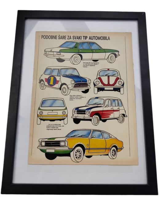 Kolor ilustracija s različitim automobilima i ukrasnim naljepnicama/varijacijama dizajna. Vrlo razigran, edukativni grafički poster – idealan za radionicu i ljubitelje automobila.