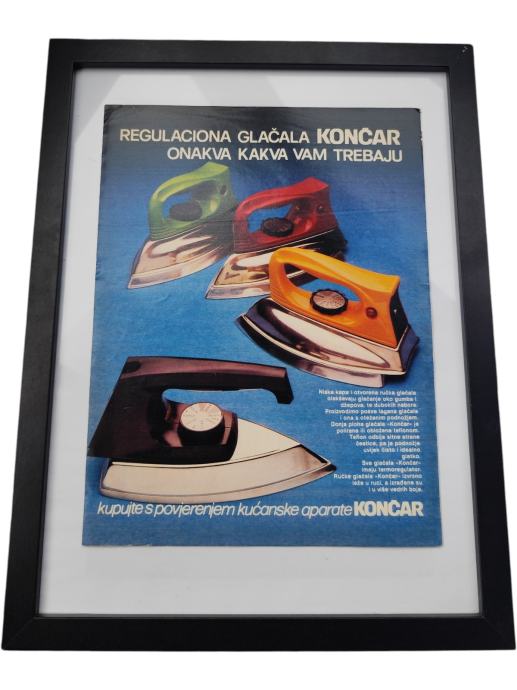 Vintage reklama za kućanske aparate tvrtke Končar. Prikazuje više modela šarenih glačala u tipičnom dizajnu 70-ih/80-ih. Jarke boje i čisti grafički stil čine je upečatljivim komadom industrijskog retro dizajna – odlična za kuhinju ili radnu sobu.