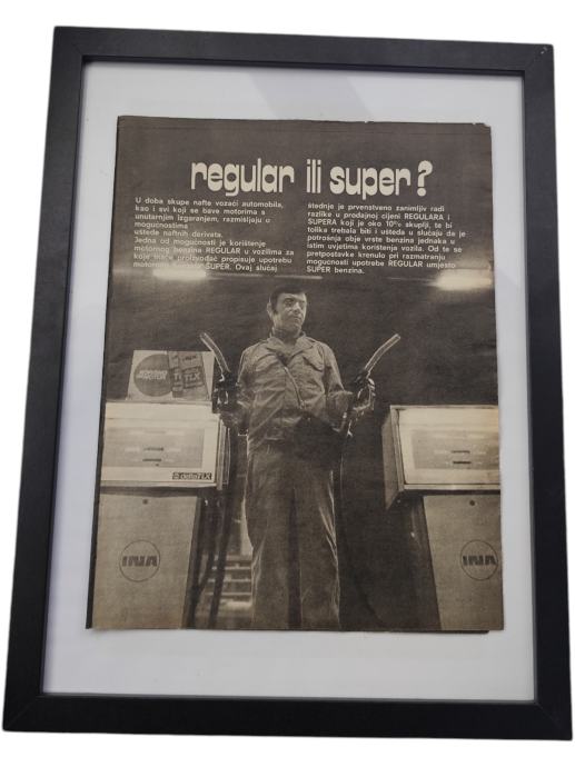 Autentična reklama za gorivo na benzinskoj postaji tvrtke INA. Industrijski i pomalo dokumentarni stil – sjajan komad za garažu, radionicu, itd...
