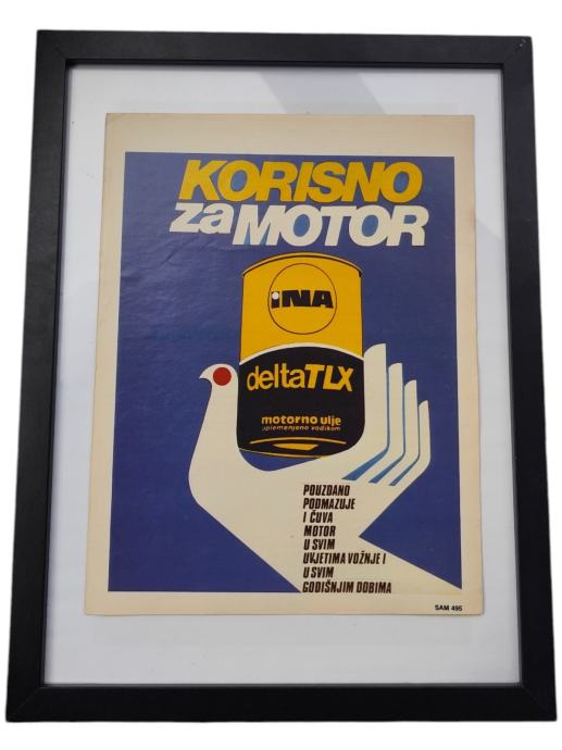 Plakat s poznatim proizvodom “Delta TIX” (motorno ulje) tvrtke INA. Čist, snažan grafički dizajn s velikim logotipom – efektan industrijski vintage dekor.