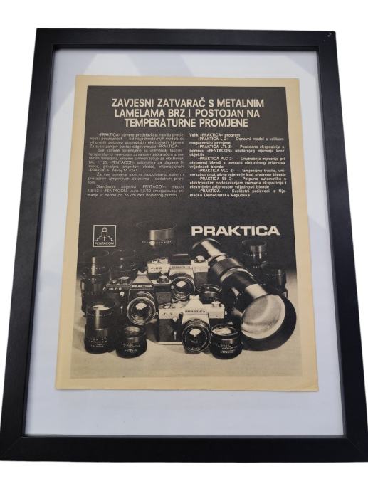 Reklama za istočnonjemačku foto-opremu Praktica (proizvodnja Pentacon). Prikaz više tijela i objektiva – odličan industrijsko-tehnički vintage motiv za fotografe i kolekcionare.