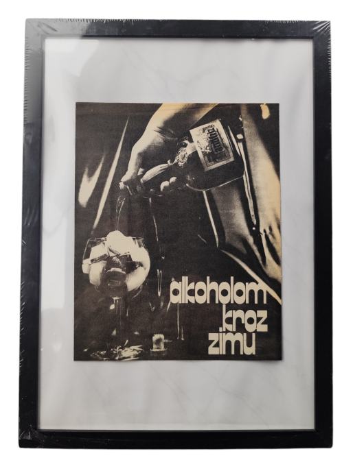 Reklama (19 x 15 cm) ima zanimljiv, duhovit, dvosmislen slogan vezan uz zimsku vožnju i održavanje vozila (antifriz/alkohol protiv smrzavanja).