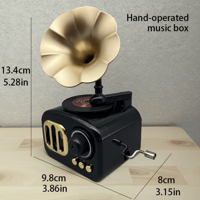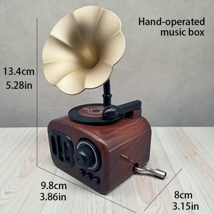 Ručno pokretana glazbena kutija - sofisticirani ukrasni komad za ugođaj kućnog dnevnog boravka, dizajniran poput stolnog gramofona.