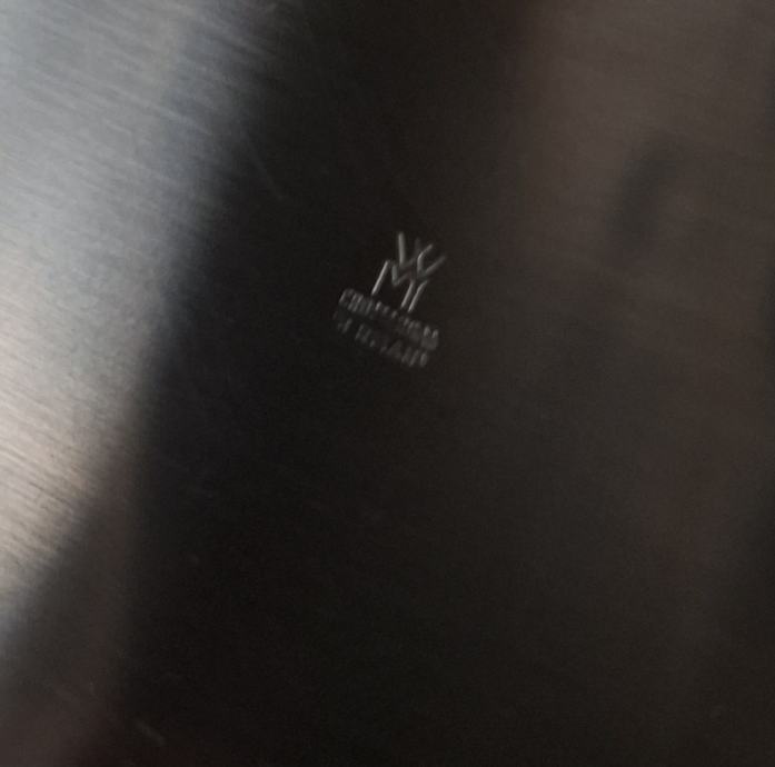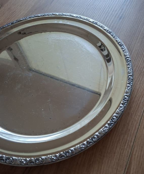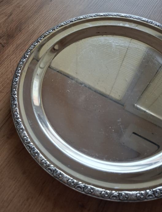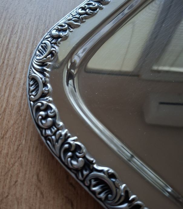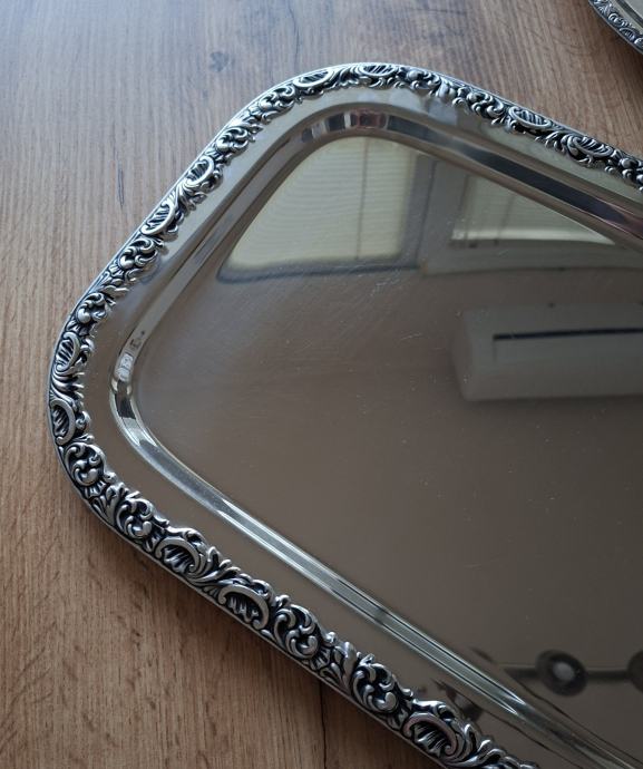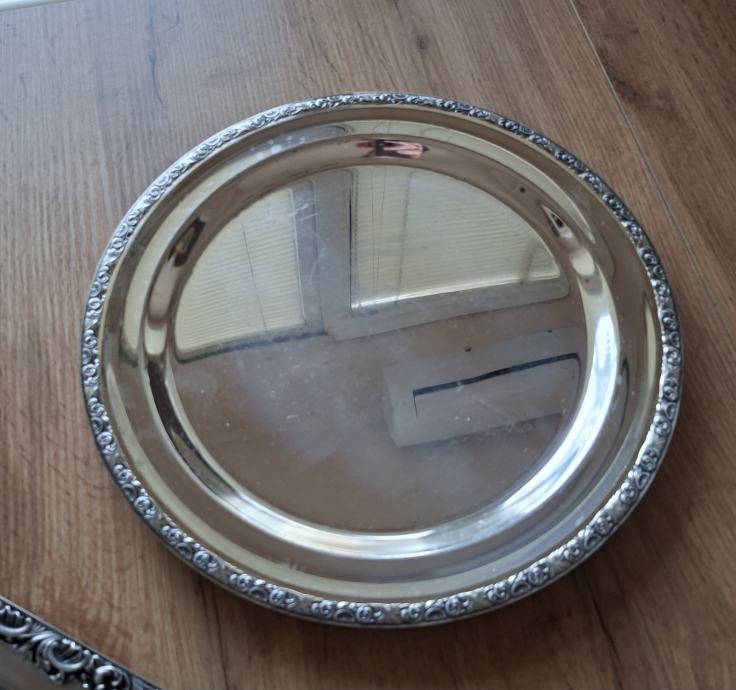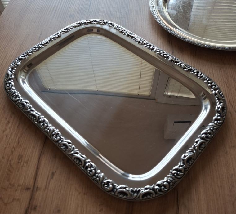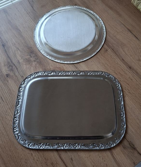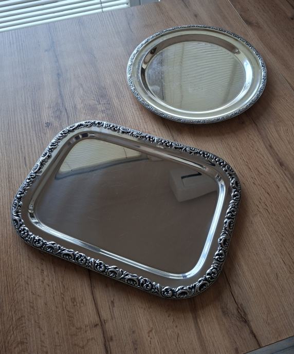 - dva orginalna WMF pladnja, pravokutni dimenzija 41x30 cm i okrugli promjera 33 cm, masivne izrade i reljefnog dekorativnog ruba, karakterističnog za starije WMF komade, površine sa vidljivom patinom i sitnim tragovima koji kao i žig potvrđuju starost i autentičnost, bez savijanja ili konstrukcijskih oštećenja.