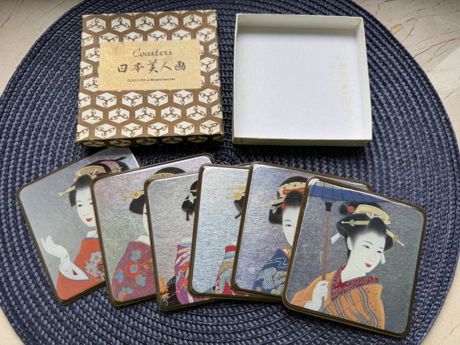 Vintage original novo zapakovani Asahi Coasters of Modern Beauties Set 6 Japanese Geisha Plastic Covers podmetaci za case