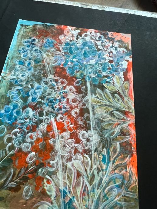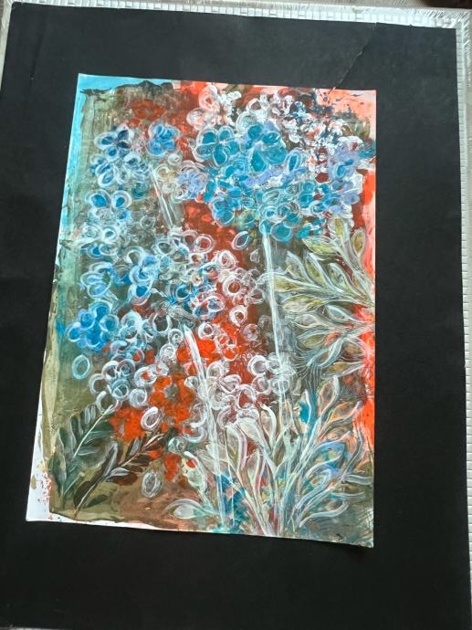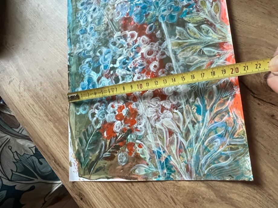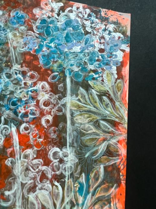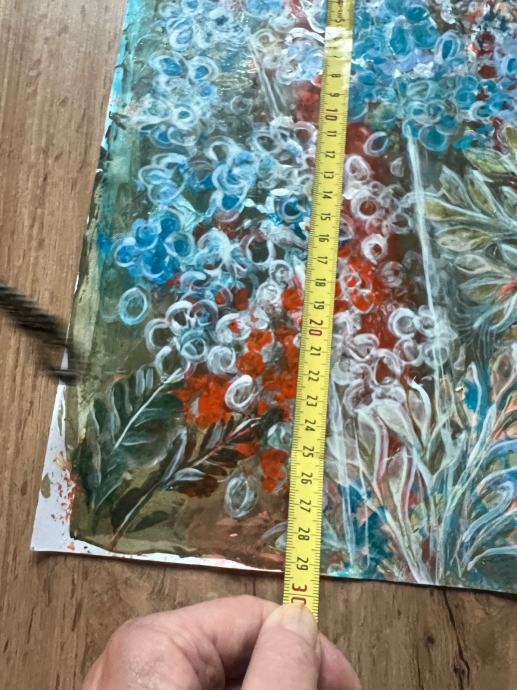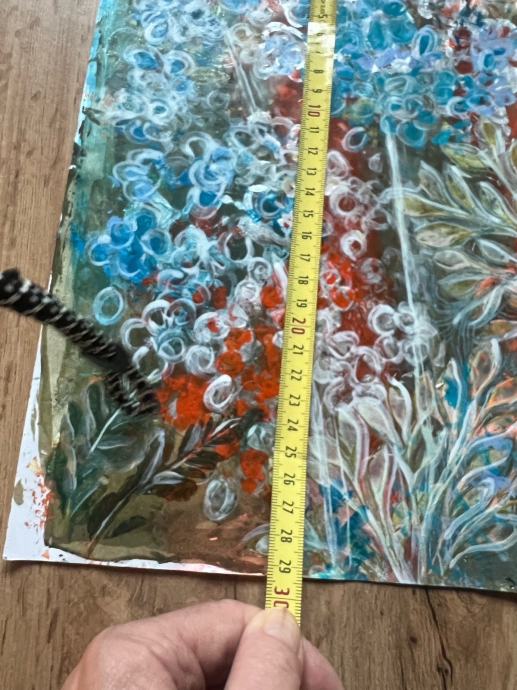 Prodajem novu akrilnu sliku s motivom cvjetnog vrta. Radi se o apstraktno-dekorativnoj kompoziciji u živim bojama – dominiraju nijanse tirkizne, narančaste, bijele i zelene. Tekstura je bogata i reljefna, što slici daje posebnu dubinu i karakter.