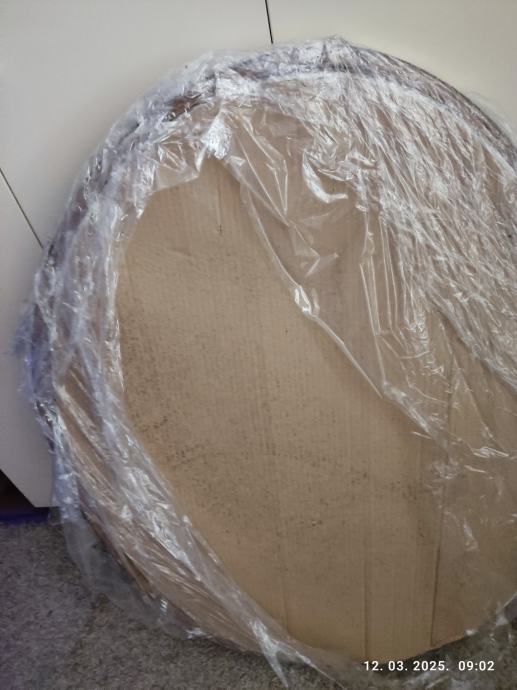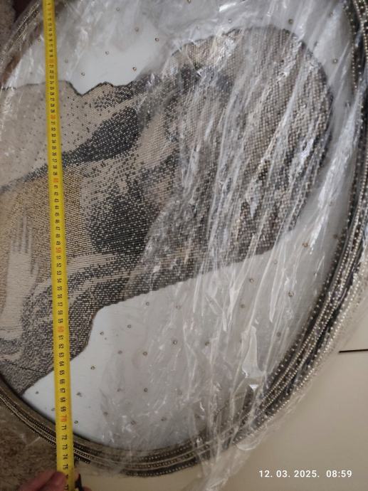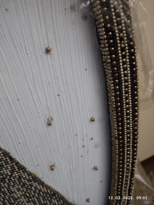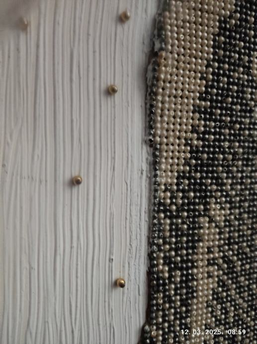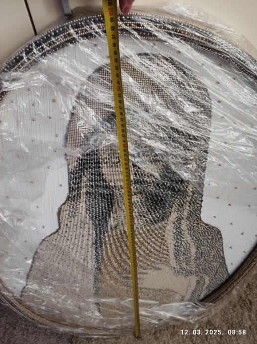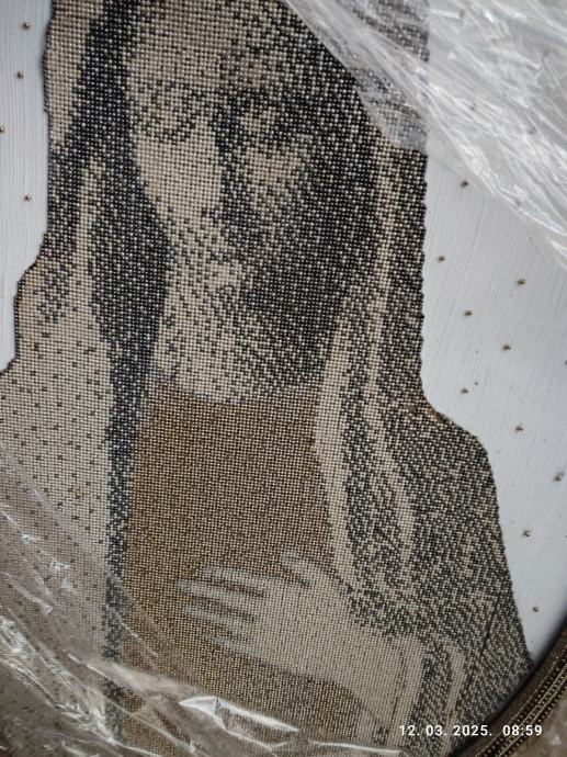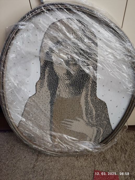 Prekrasni prikaz Majke božje sačinjen na drvu od perlica ( zbog težine slika izašla djelomično iz okvira)