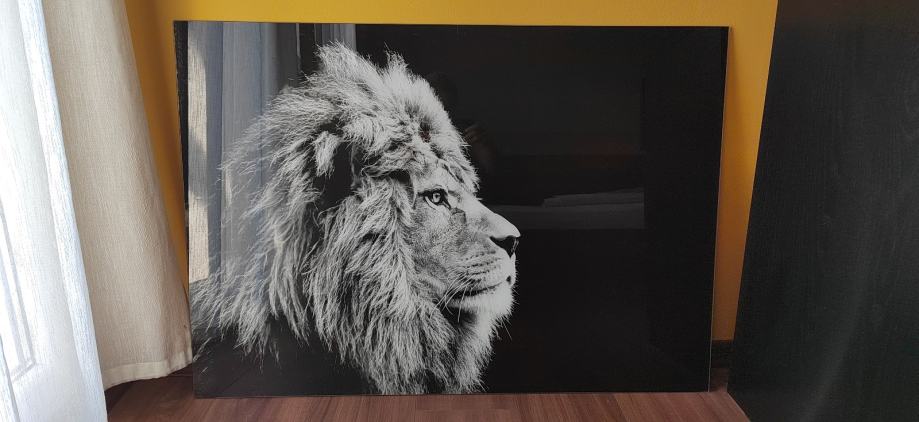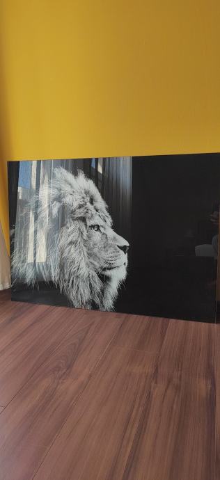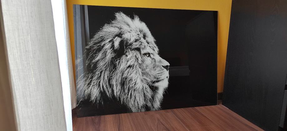 Staklena slika + posebne nosači za sliku. Lav. Dimenzije 70x100cm