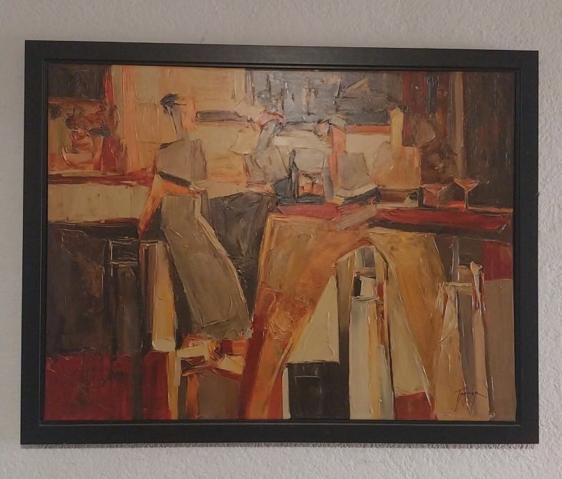 Ovo je masivno ulje na platnu s izraženom teksturom i toplim zemljanim tonovima, koje prikazuje scenu iz starog bara/kavane. Likovi naslikani u kubističko-impresionističkom stilu daju slici posebnu dinamiku, a kombinacija snažnih poteza i atmosfere čini je pravim statement komadom u prostoru.