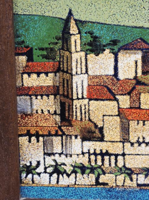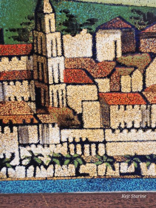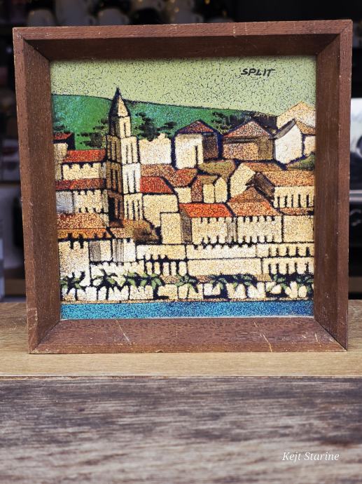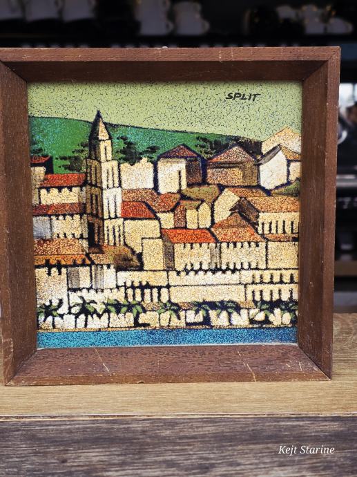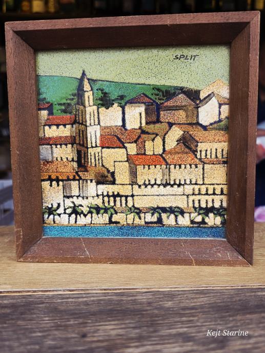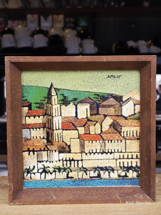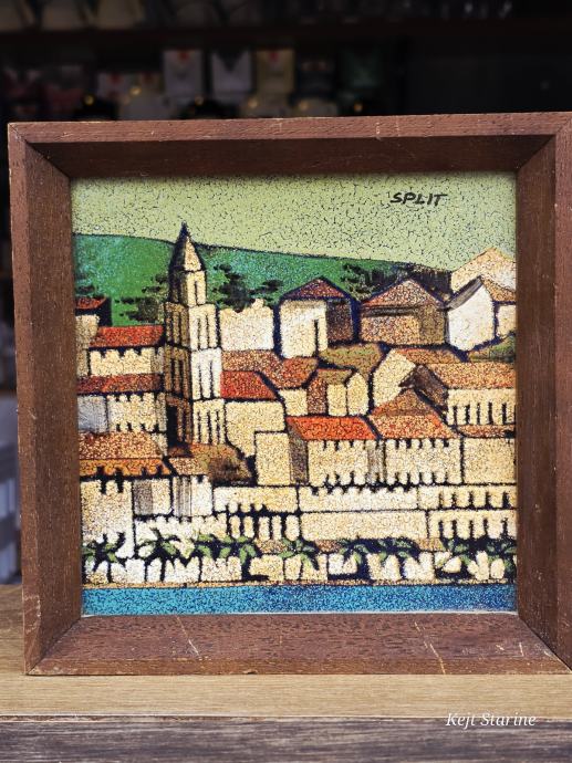 Prepoznatljiva vizura Splita, s fokusom na zvonik katedrale sv. Duje i Dioklecijanovu palaču, izrađenu u tehnici koja podsjeća na mozaik na emajlu.