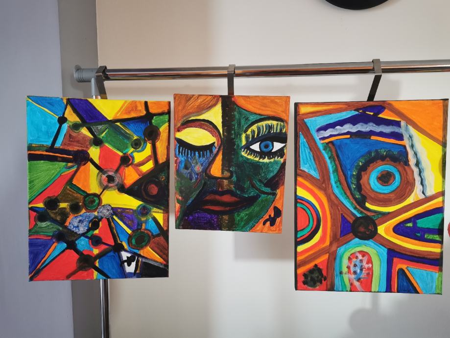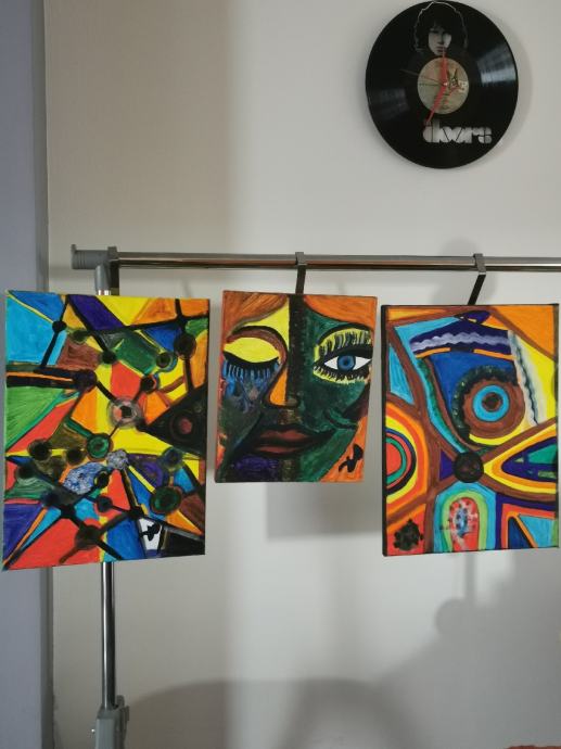 Komplet 3 apstraktne slike, akril boje na platnu, umjetnice koja od malena obožava boje i oblike. Komplet 20 EUR, svaka za sebe po 8 EUR.
