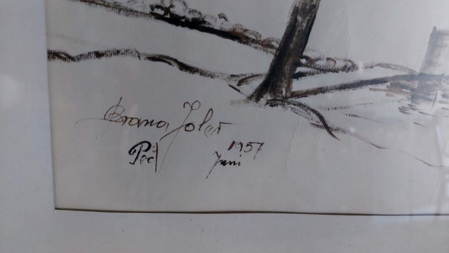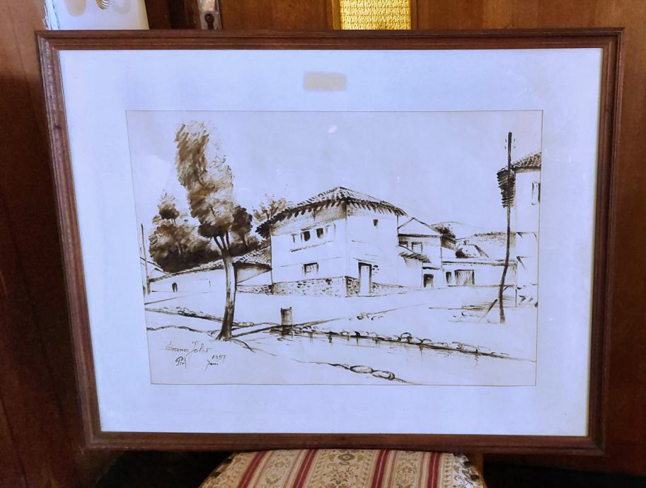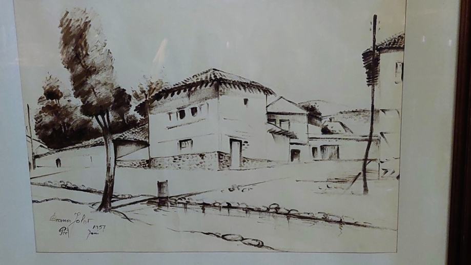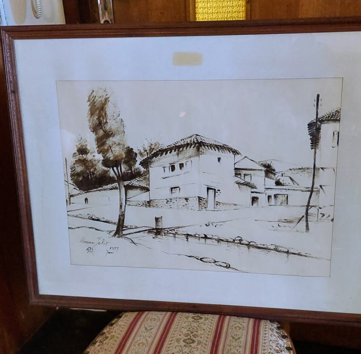 Slika u crno bijeloj tehnici, kuća, drvo i okolo kuće i ograda. Slika je iz 1957. godine. Dimenzije 52x38