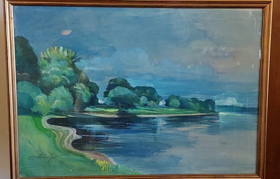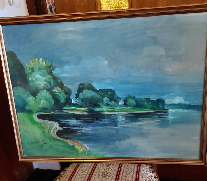 Slika plavih boja, rijeka, obala, drveće. Naslikana 1982. godine. Dimenzije 59x69
