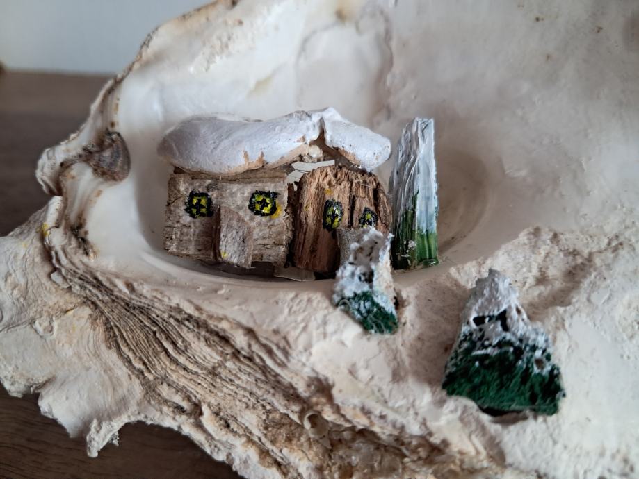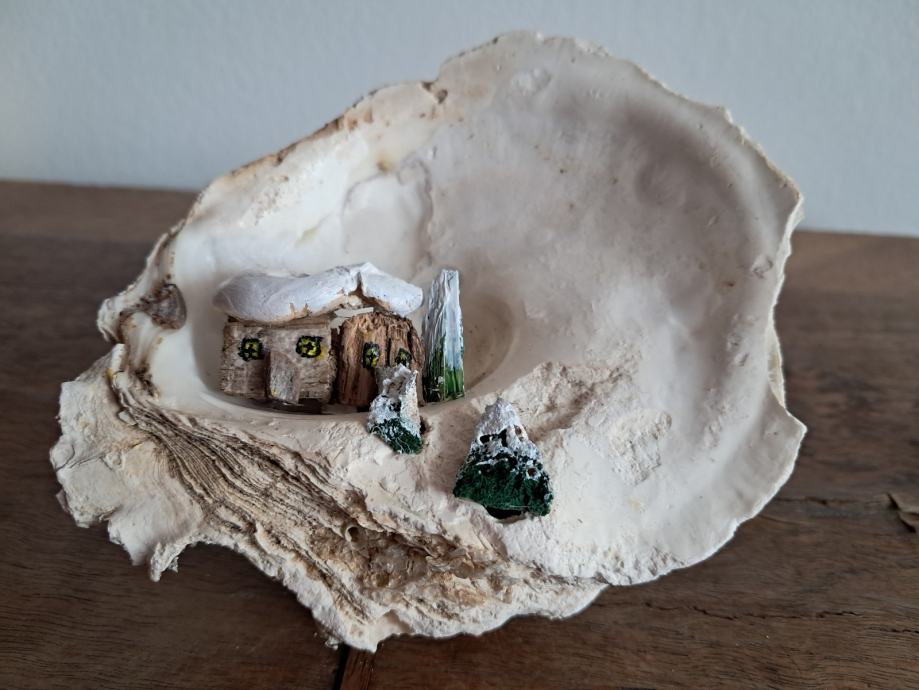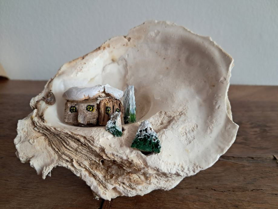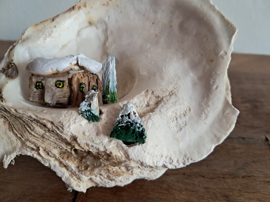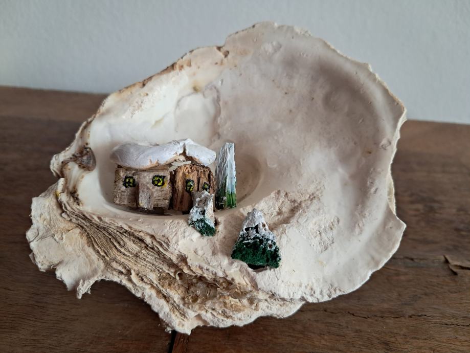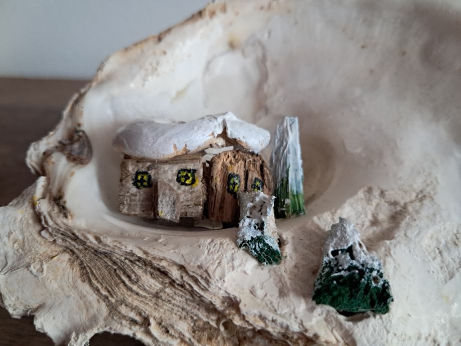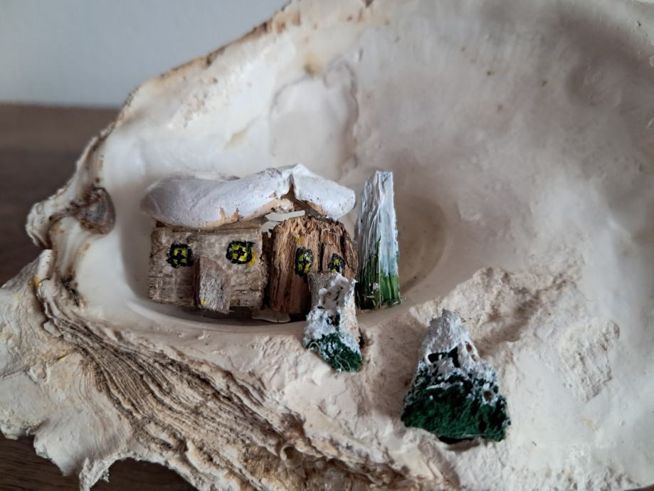 Ova slatka dekoracija izrađena je od morske školjke i malih naplavina.Uz dodatak akrilne boje i detalja nastao je sićušan bajkovit svijet pod snijegom.Dimenzija je 12 × 12 cm.