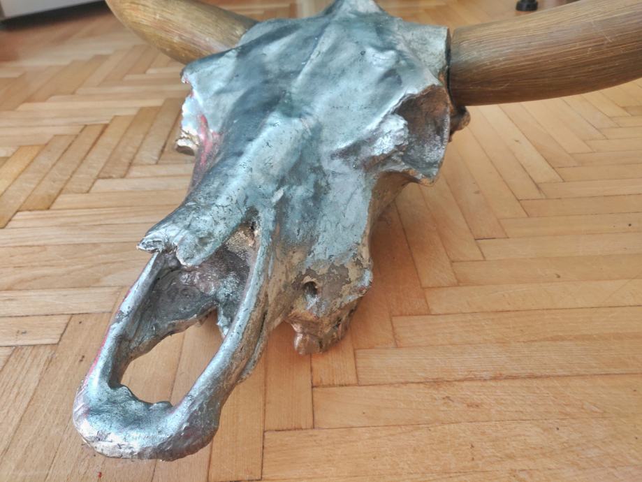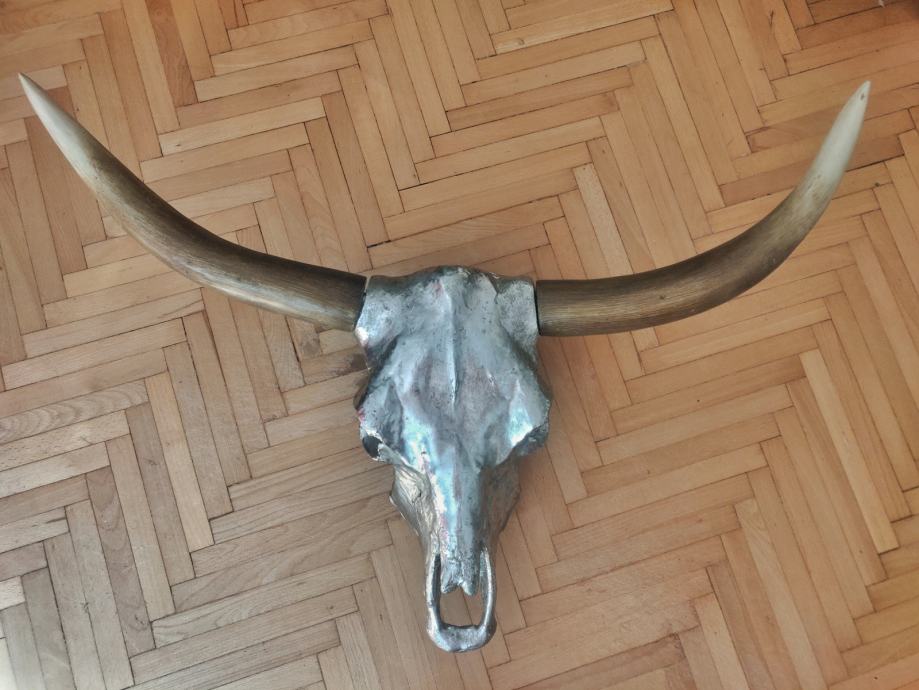 Dekorativna lubanja s rogovima, srebrne boje, ukras za zid.