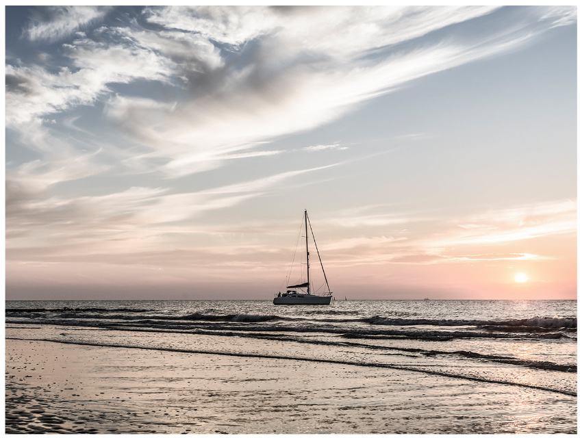 Staklena slika jedrilice uz zalazak sunca. Dimenzije su 80x120cm.