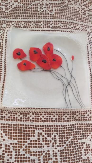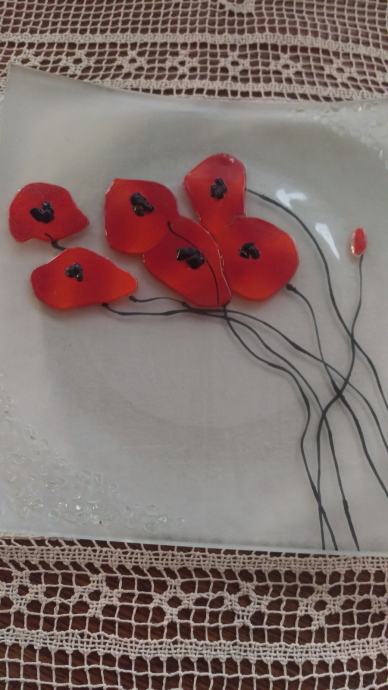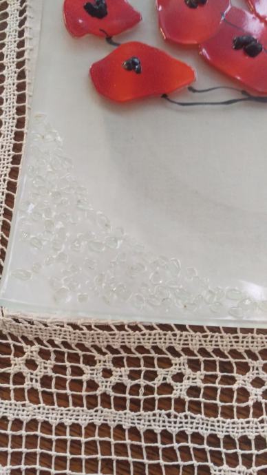 Prodajem krasan četverokutni, stakleni, dekorativni tanjur s makovima. Tanjur je kao novi, jako očuvan. Dimenzije su 30 x 30 cm, a dijagonano 40cm.Slike govore sve.