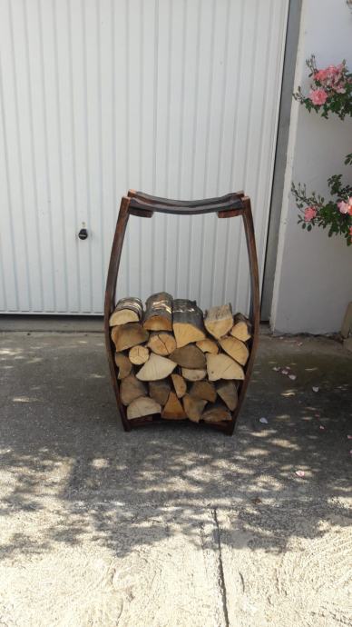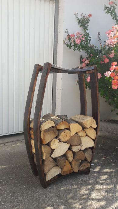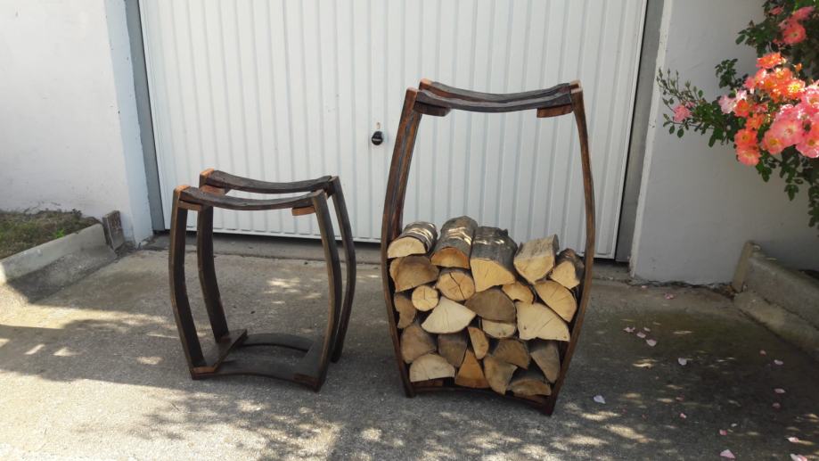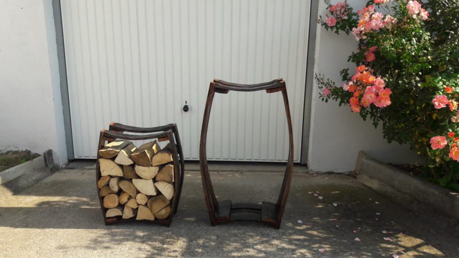 Stalci, držači za drva i cjepanice izrađeni od starih hrastovih bačvi.