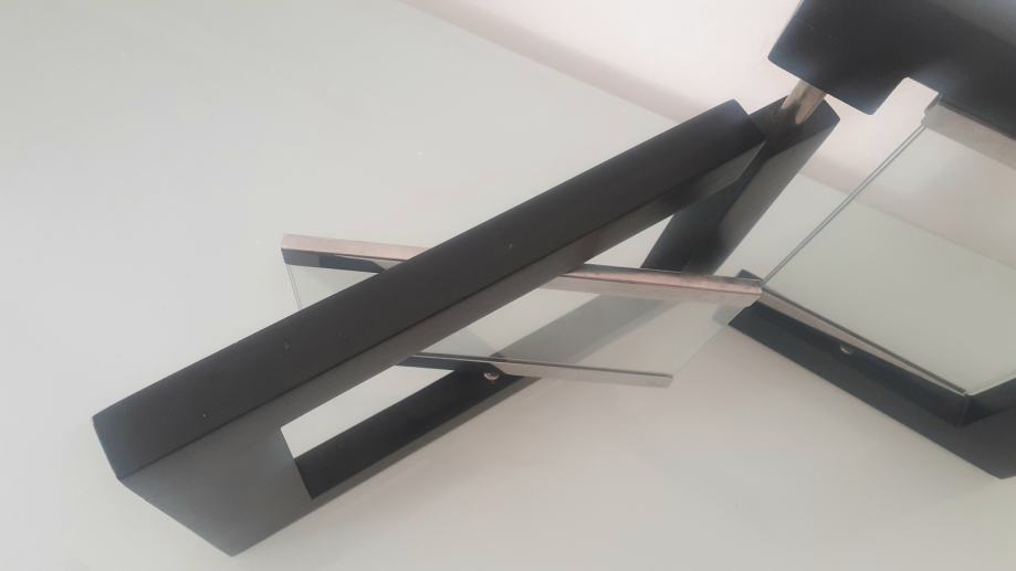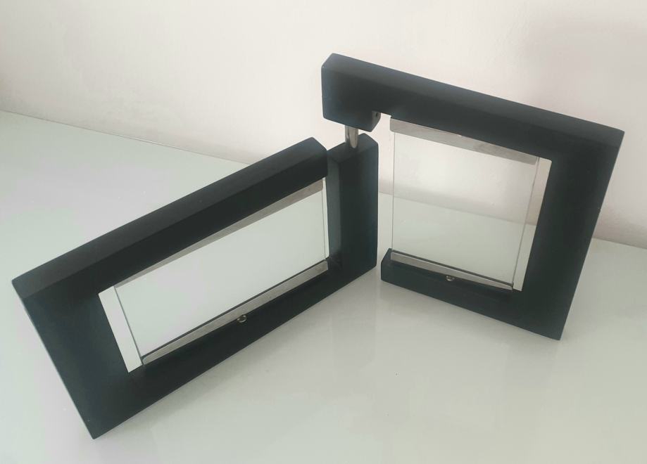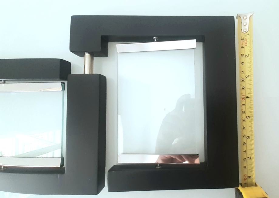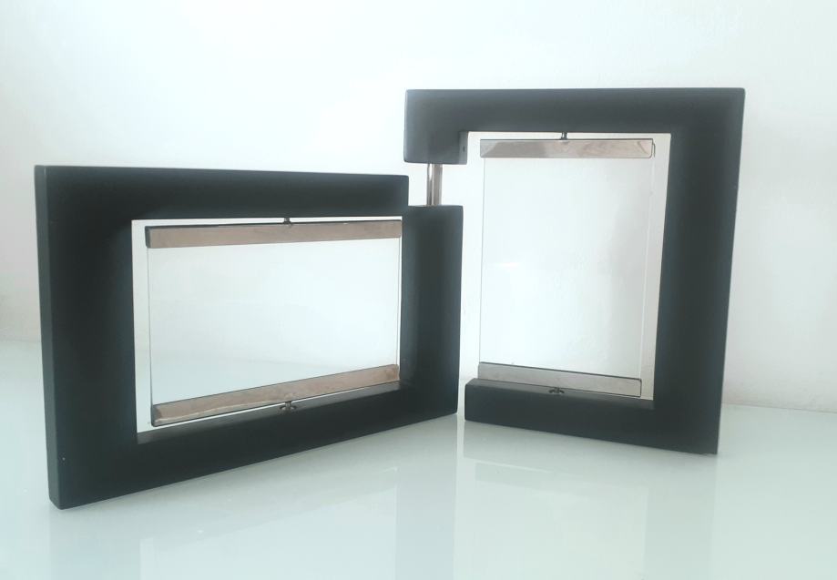 Drveni stalak za fotografije. U svakom okviru 2 stakla u koja se umetne fotografija. Ukupna dižina 42 cm, visina višeg dijela 21 cm.