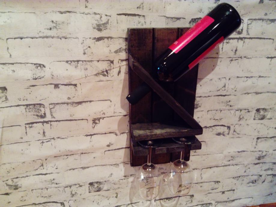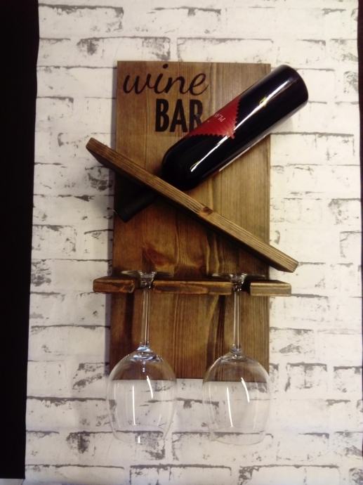Ručno rađeni stalak od jelovine za butelju i 2 vinske čaše.