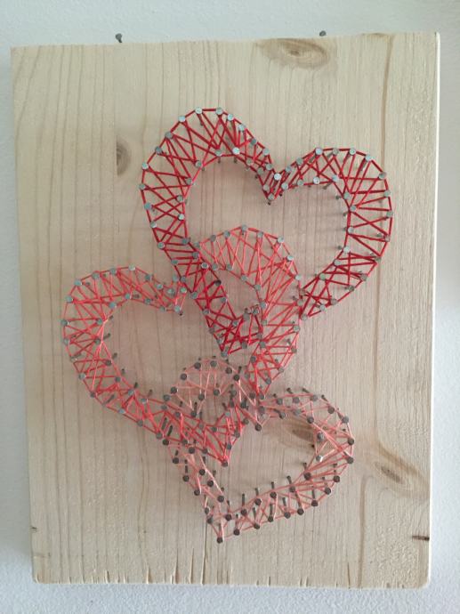 Ručni rad, string art - Isprepletena srca. String art je tehnika omatanja konca oko čavlića zakuckanih prema nekoj šabloni na čvrstu podlogu. Veličina 19 x 26 cm.