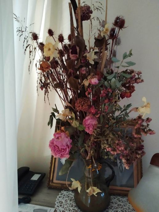 Veliki ukrasni aranžman od suhog cvijeća i bilja. Djelomično bojan i lakiran za dodatnu čvrstoću i trajnost. Cijena aranžmana je 20 eura (bez vaze).