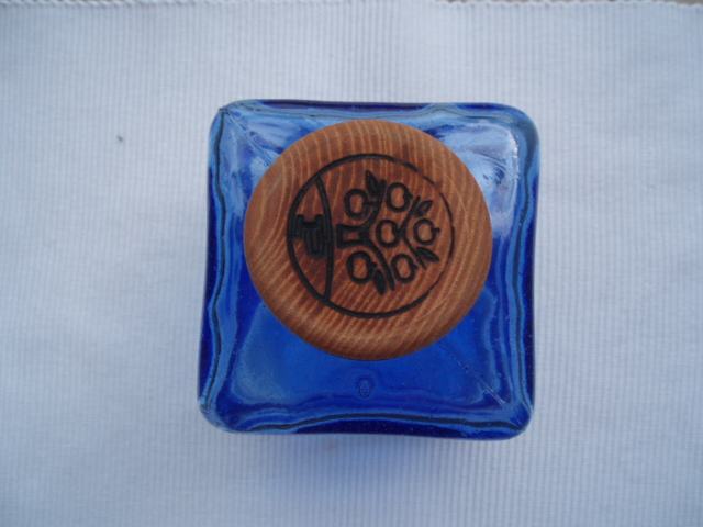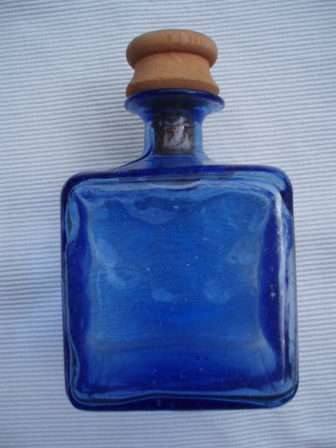 svijetlo plava flaša od debelog stakla, zapremnine 7 dcl, sa originalnim čepom kombinacije pluto-drvo.