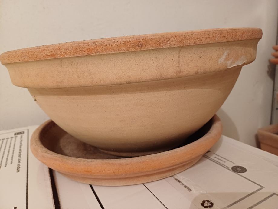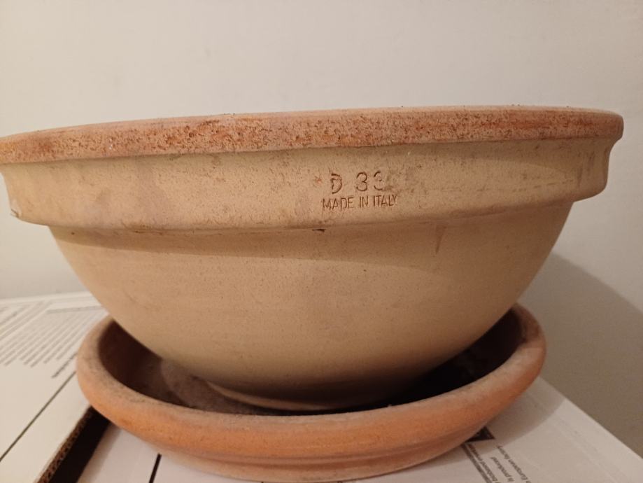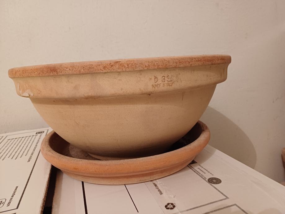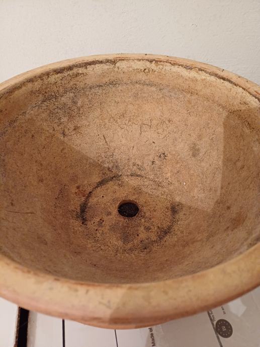Posuda za cvijeće od terakote, promjera 33 cm, visine 14 cm. Sa pripadajućim podloškom od terakote, promjera 27,5 cm.