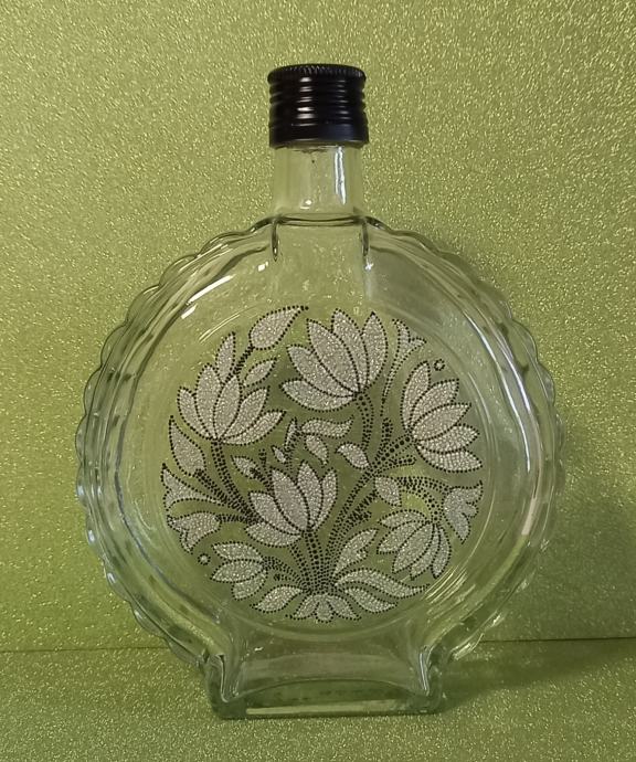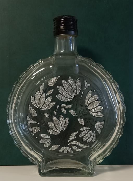 Ukrasna boca za rakiju. Ukrašena bojama za staklo. Prelakirano bezbojnim lakom. Ručni rad.