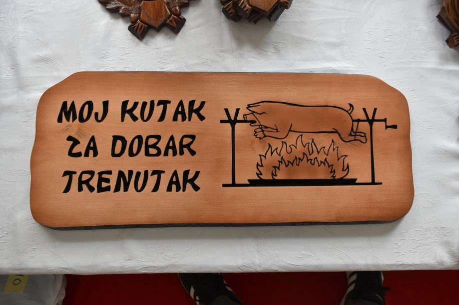 Gravirana drvena tabla s natpisom crne boje te slikom premazana lakom koji joj pomaže za dugotrajnost.