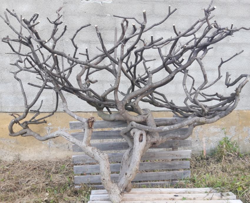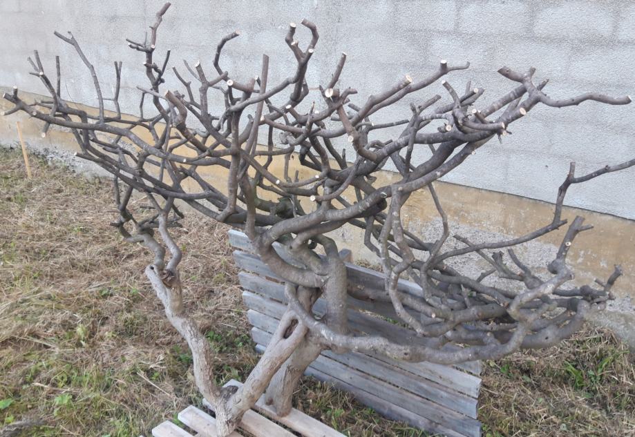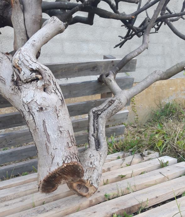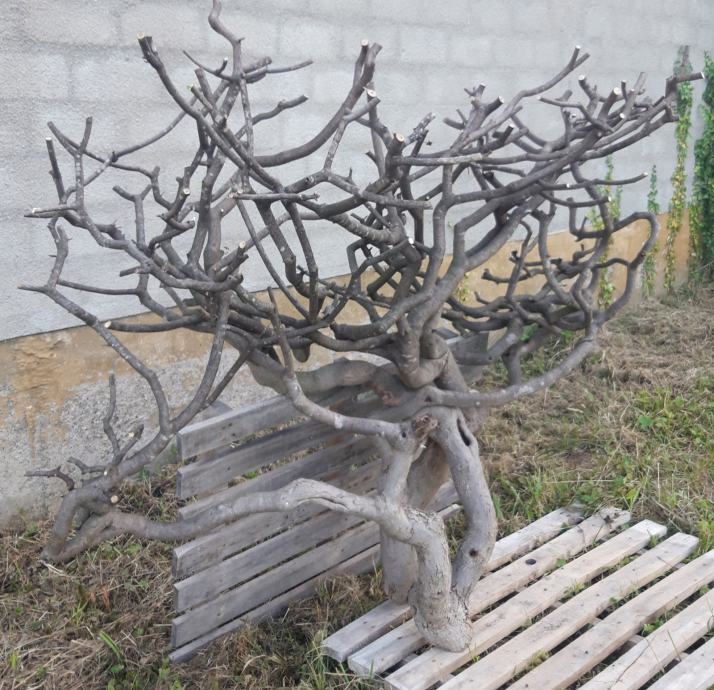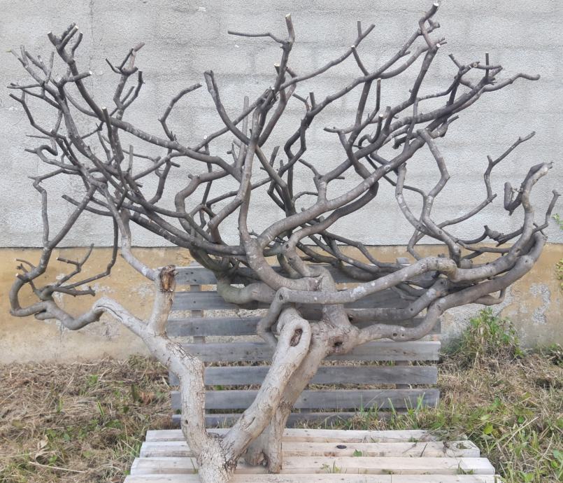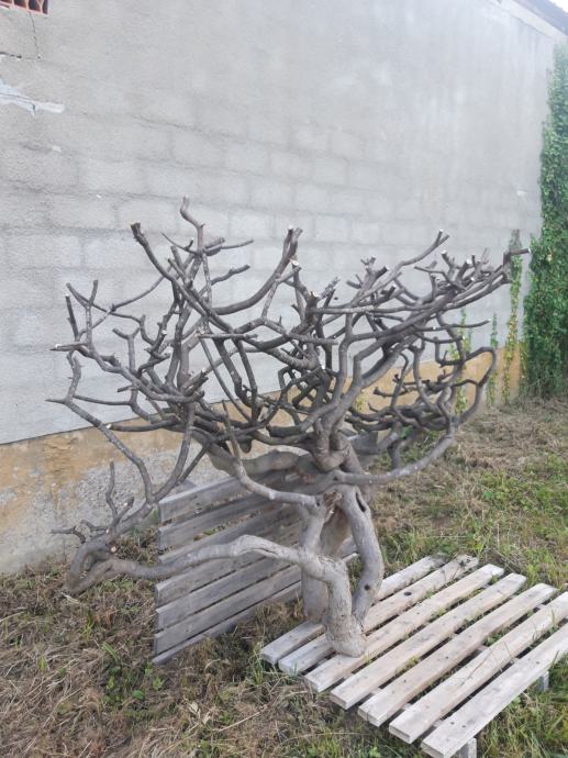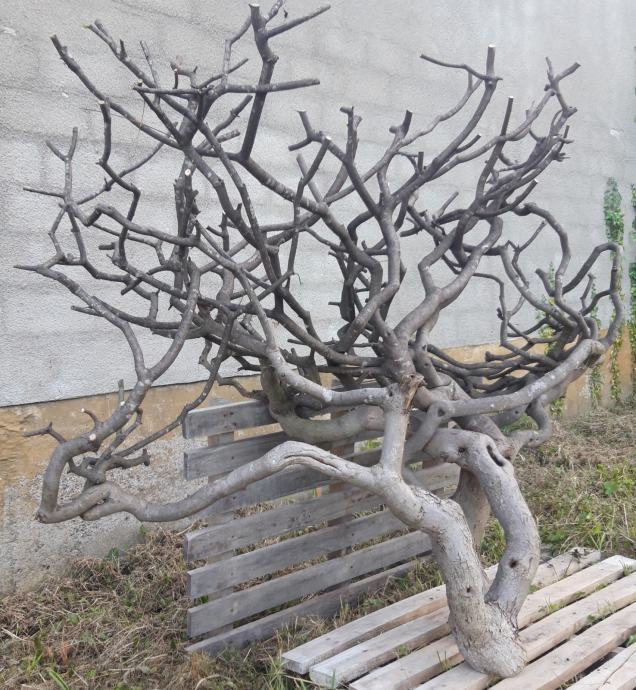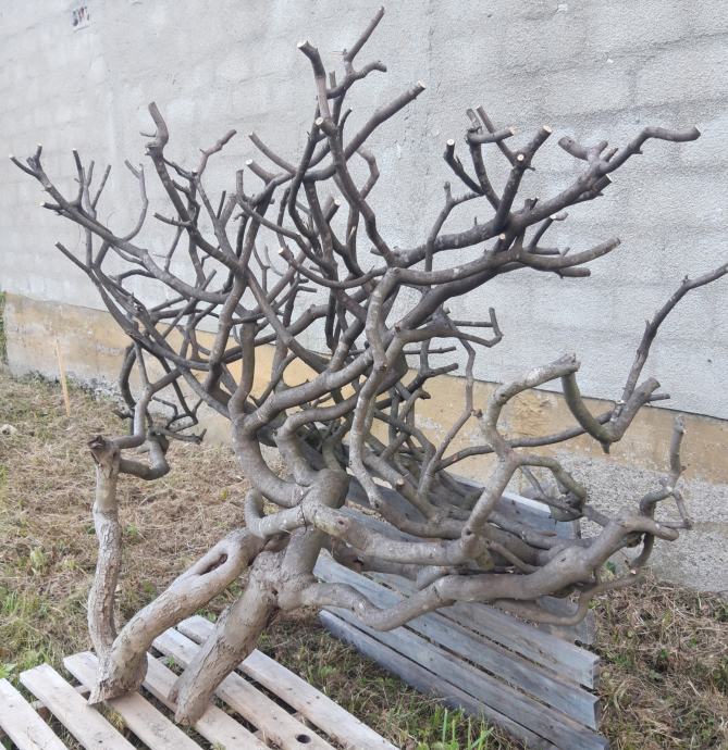 Suhi ukrasnim grm tj. 2 stabla, staro je oko 70 godina. Dimenzije su mu: visina 170 cm, širina 200 cm, dubina 120 cm. Debljina stabala oko 12 cm. Djeluje vrlo inspirativno, puno grana je godinama bilo spojeno u rastu i tako su mnoge grane srasle jedna za drugu. Stablo je iz dva debla, kao i obiteljsko stablo, a grana se na mnoge grane koje se povezuju te su spojene. Bilo je u botanickom vrtu jedne stare vile. Može biti ukras za dom, za različite nastambe za ptice ili druge životinje. Odrezano je prije 2 mjeseca prosuseno i vrlo čvrsto. Nije za ništa korišteno, bilo samo vani na zraku. Prodajem ga za 100 eura. Mob 091 444 4281