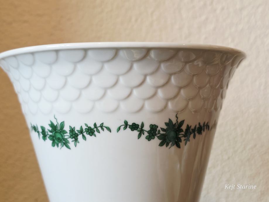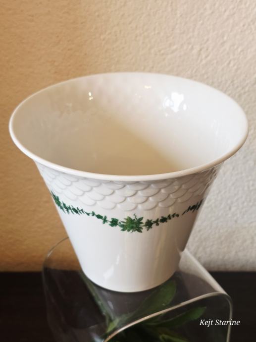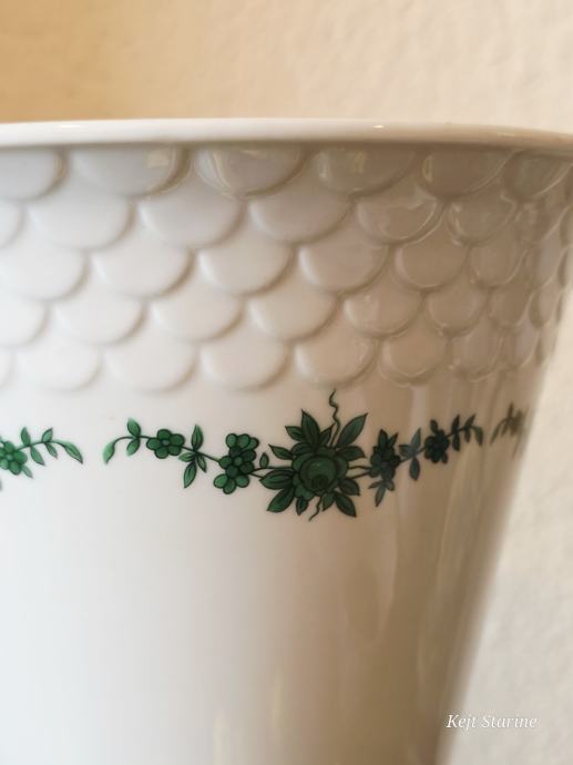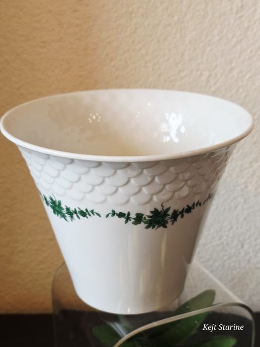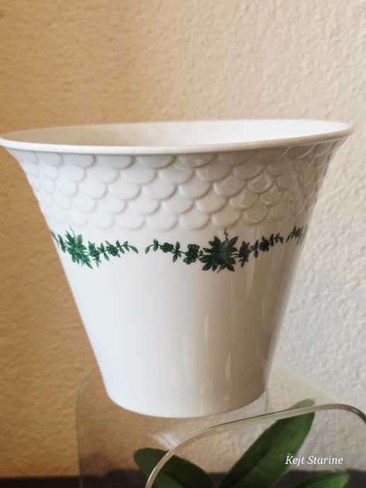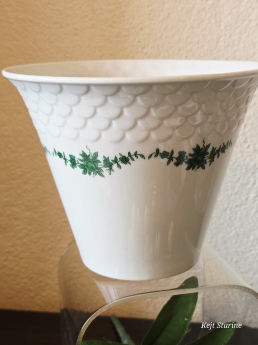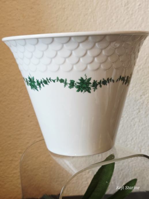 Fürstenberg porculanska posuda za cvijeće (ili vaza) iz serije dizajna pod nazivom Schlossgarten. Izrađena je od bijelog porculana s reljefnim uzorkom ljuskica na gornjem dijelu i zelenim cvjetnim motivom.
