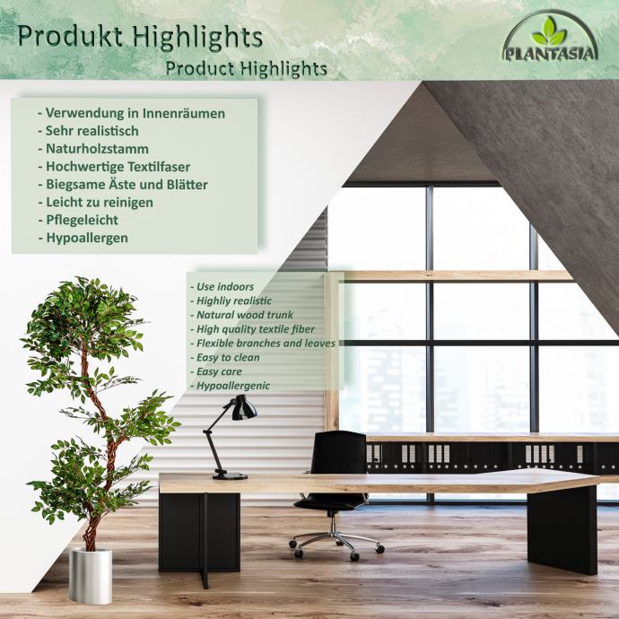 Umjetno drvce od niza PLANTASIJE visoko je 160 cm i ima autentično ukorijenjeno deblo prave palme, a sofora također ima 1764 lista izrađenih od visokokvalitetnih tekstilnih vlakana. Naša Fruticosa stoji u stabilnoj posudi s cementnom bazom promjera 20 x H 15 cm.