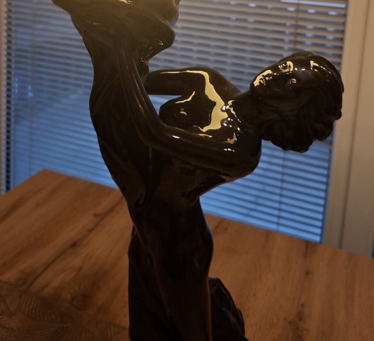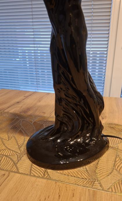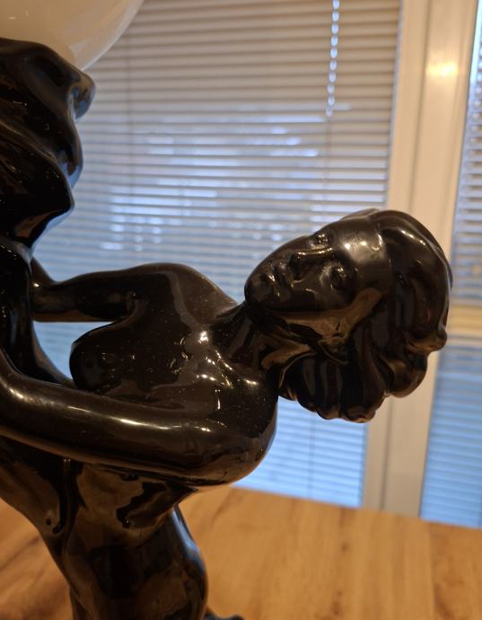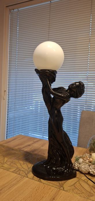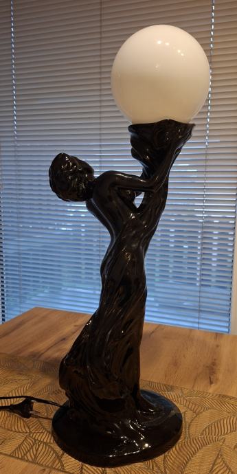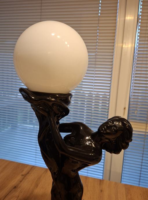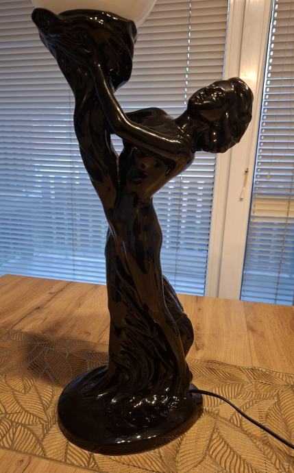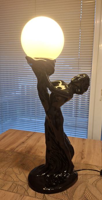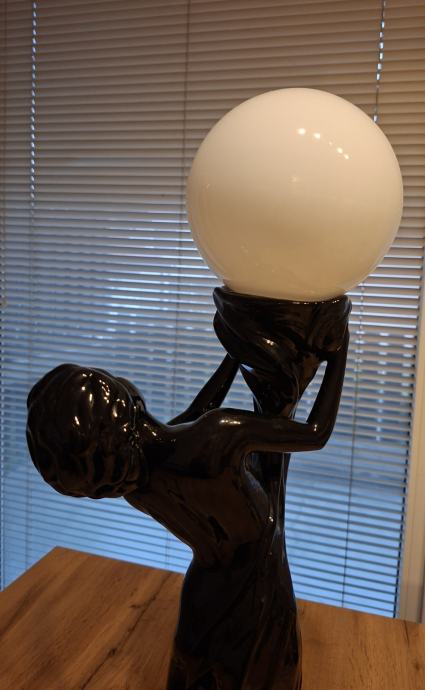 - velika i upečatljiva lampa - figura žene koja drži mliječno bijelu staklenu kuglu, izrađena od crne polirane keramike, iznimno dekorativan i masivan komad visine 66 cm, u cijelosti ispravna, očuvana, bez oštećenja, spremna za korištenje.
