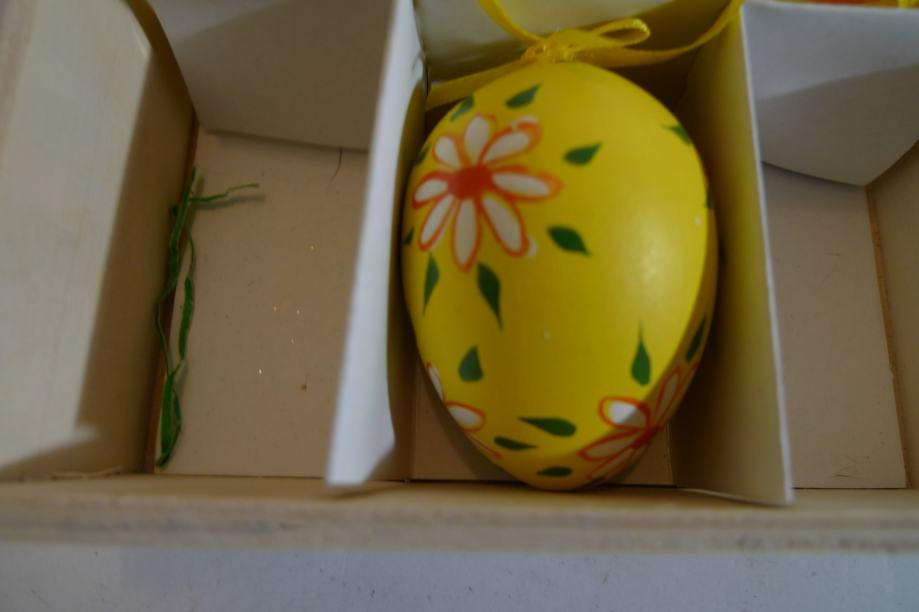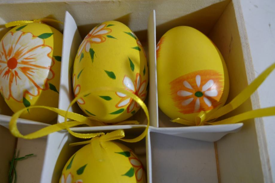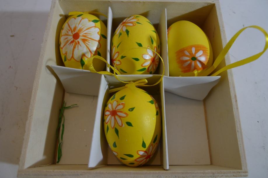 Četiri plastična jaja u drvenoj kutiji s vezicama za vješanje, žuta ukrašena cvjetovima.