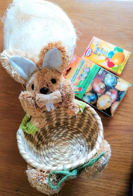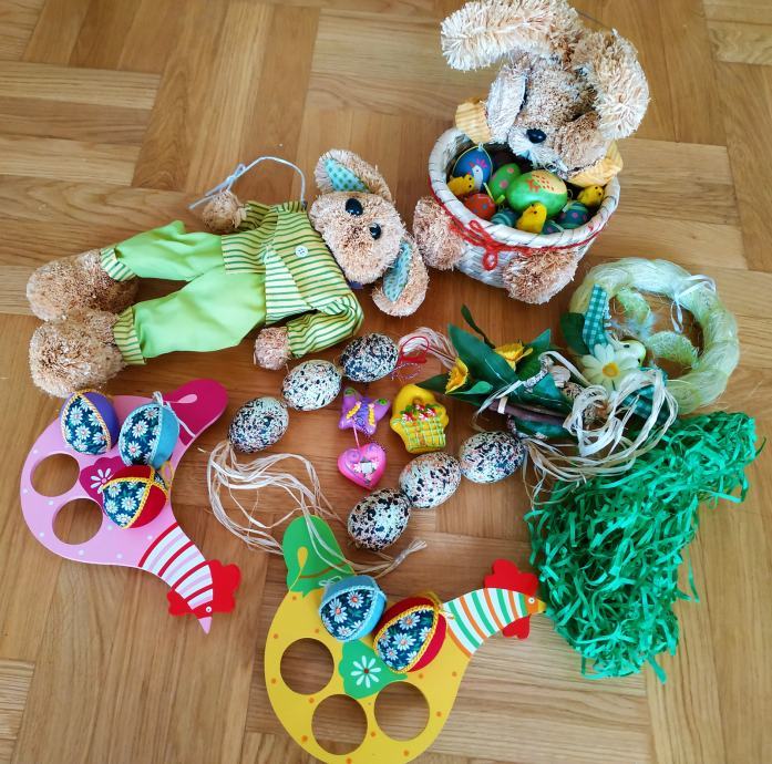 Razne USKRŠNJE dekoracije, set na 2 slike u kompletu - zec, koka stalak, zec košare, pisanice, slama, vijenci, boje za jaja.