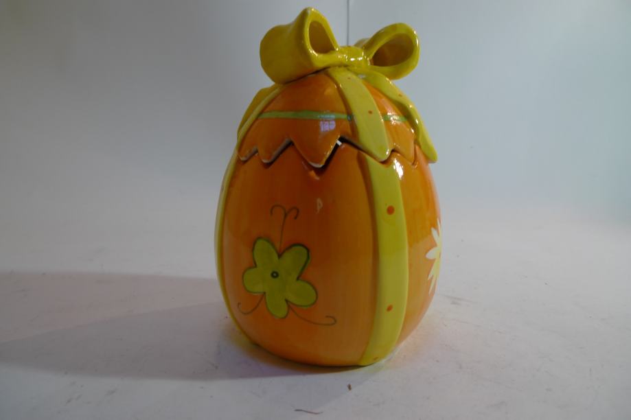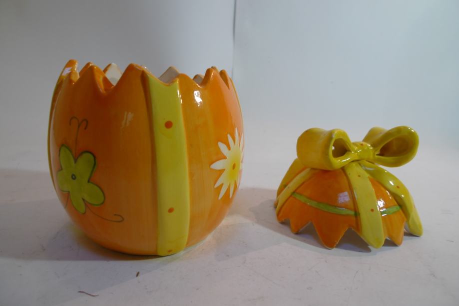 Veliko uskršnje jaje s poklopcem. Od keramike je karančaste boje cvjetnog uzorka s mašnom. Visina jaja je 18 cm.
