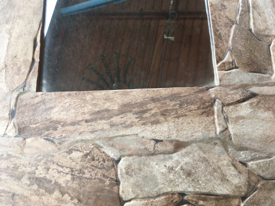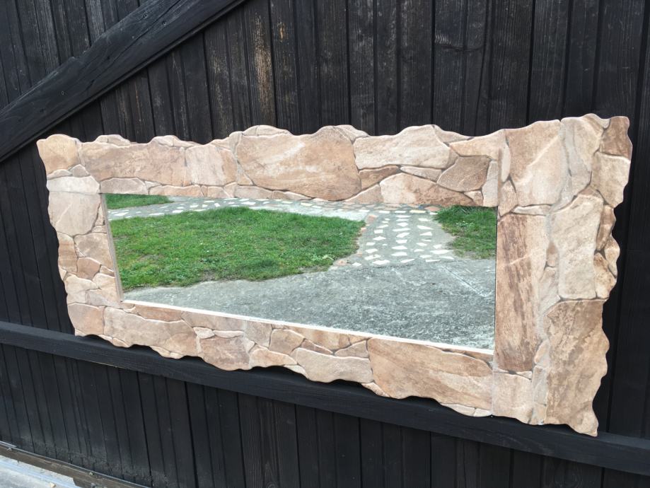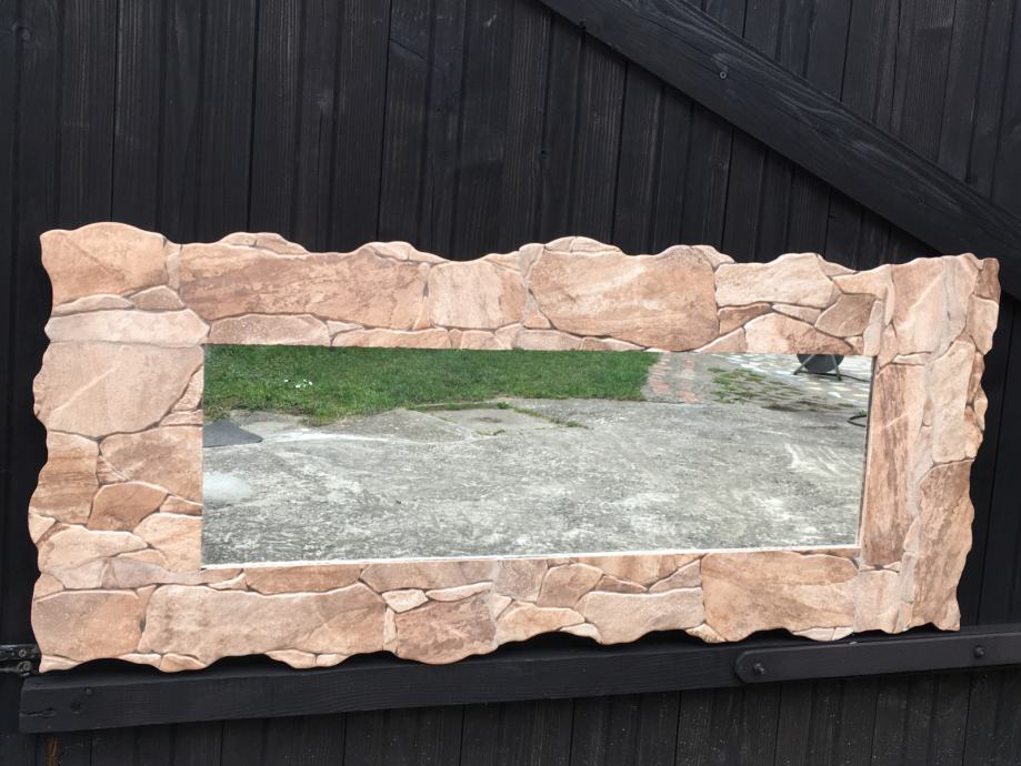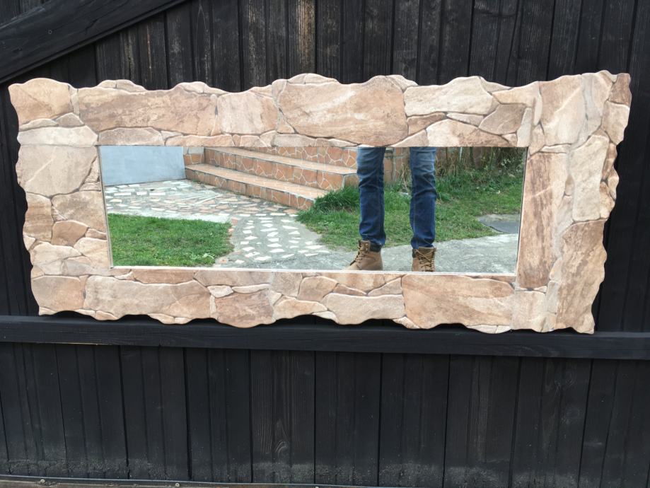 Prodajem veliko zidno ogledalo napravljeno od debelog ogledala na postolju sa okvirom od kamena - keramičke pločice u obliku kamena.