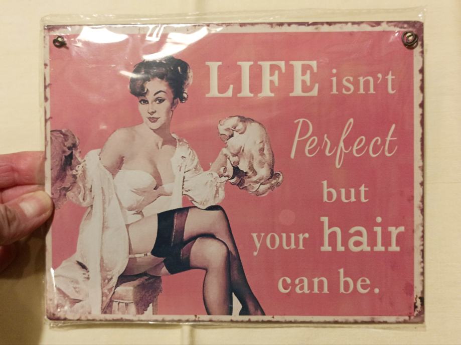 s pin-up crtežom, i porukom "Life isn't perfect but your hair can be."