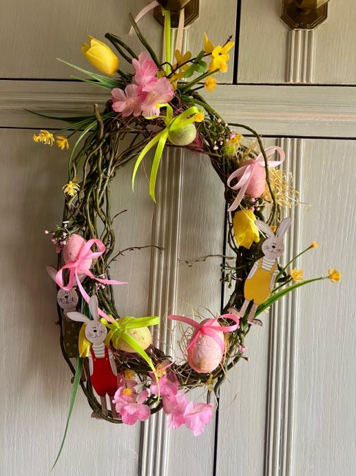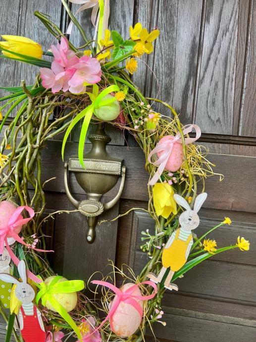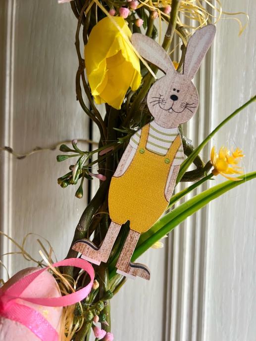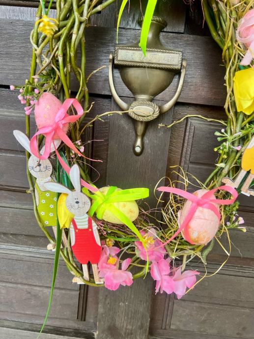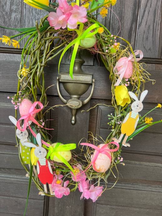 Prodajem nov uskršnji vjenčić izrađen od prirodnih grančica ovalnog oblika. Ukrašen je šarenim uskršnjim jajima s ružičastim i žuto-zelenim mašnama, drvenim figuricama zečića te umjetnim cvijećem u rozoj i žutoj boji. Dekoracija je vesela i živopisna, prikladna za vješanje na vrata ili kao ukras u domu za blagdansko razdoblje.