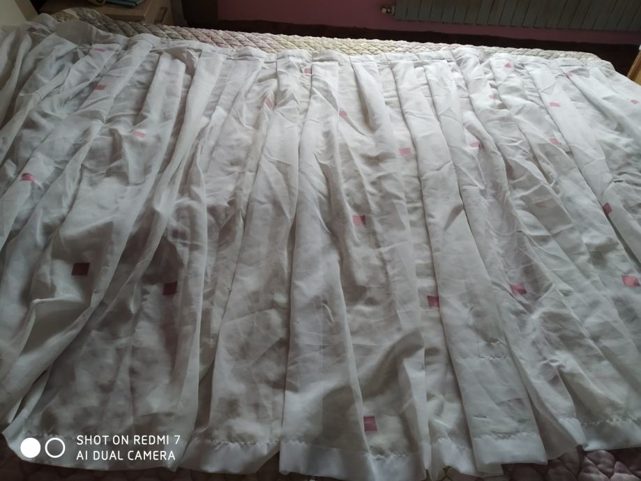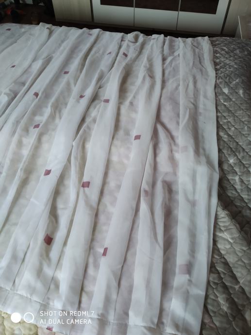 Prodaju se dvije korištene zavjese za prozore. Dulja zavjesa je visine 205 cm i širine 152 cm i ima mala oštećenja na donjem dijelu od grebanja mačaka. Kraća zavjesa je visine 133 cm i širine 210 cm i ona je bez oštećenja.