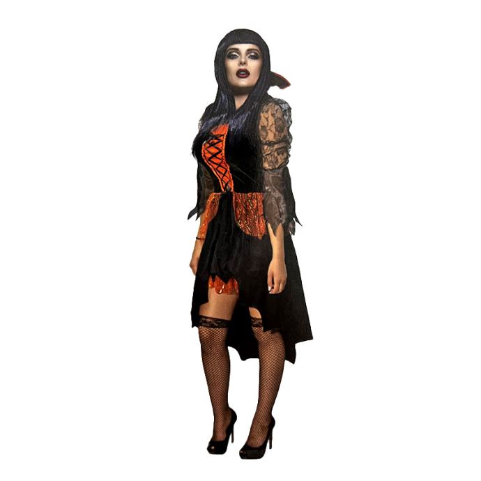 Crvena i crna boja dominiraju kostimom, simbolizirajući klasičan izgled vještice ili zle vražice.