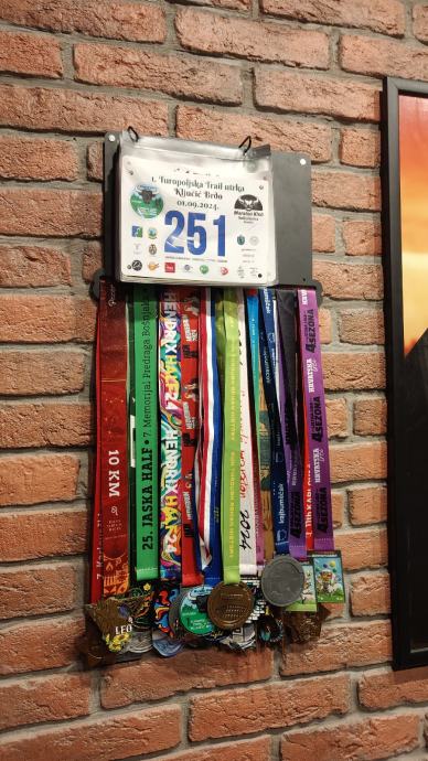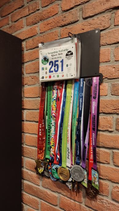 Prodajem metalni stalak za medalje iz razloga što mi je isti postao premalen. Uz stalak dobijete i 10 plastičnih košuljica za spremanje startnih brojeva sa utrka.