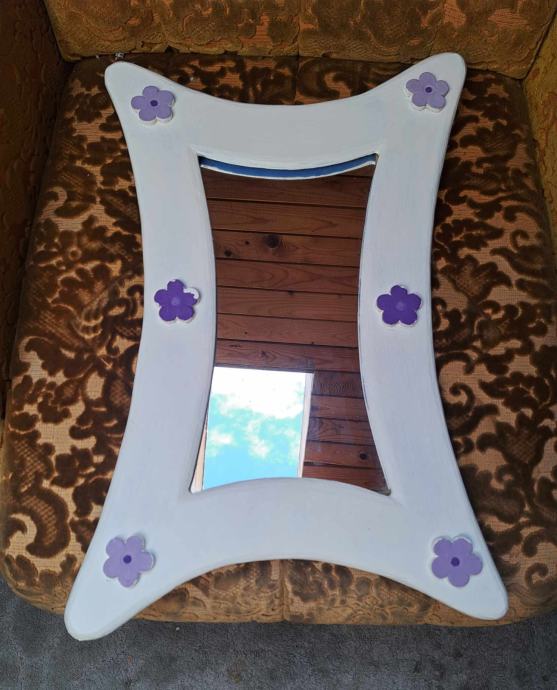 Zidno ogledalo bijele boje sa ljubičastim cvjetovima. Veličine 58cmx39cm, staklo 32x18cm.