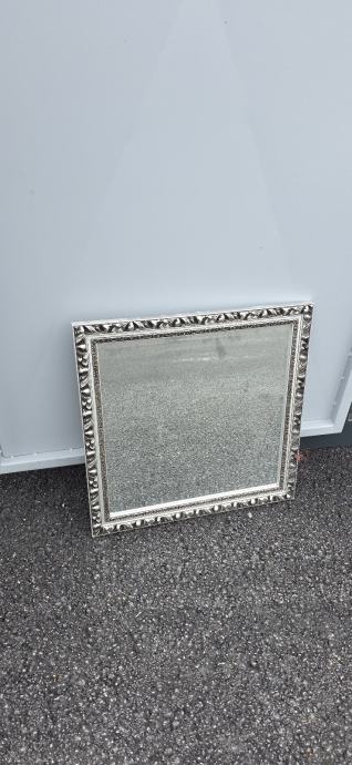 Prodajem zrcalo s ukrasnim okvirom u srebrnoj boji. Okvir je bogato dekoriran s ornamentima, što mu daje klasičan i elegantan izgled. Kvadratnog je oblika i prikladno je za vješanje na zid.